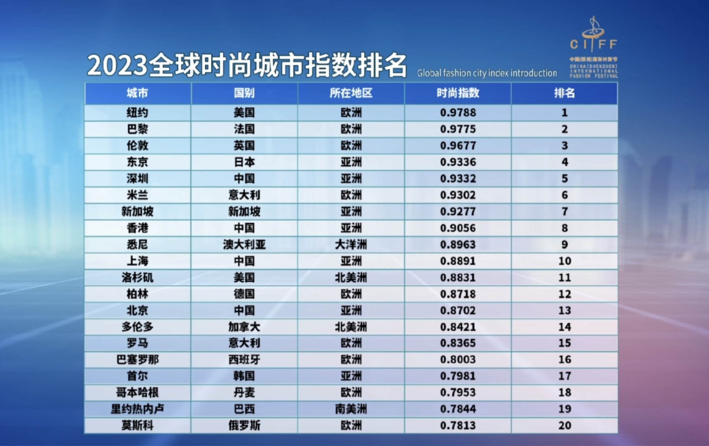 本届时装节发布了2023全球时尚城市指数,排名前20名的城市分别是:纽约、巴黎、伦敦、东京、深圳、米兰、新加坡、香港、悉尼、上海、洛杉矶、柏林、北京、多伦多、罗马、巴塞罗那、首尔、哥本哈根、里约热内卢、莫斯科。结果表明,深圳位列第五,进一步夯实全球六大时尚之都地位。标志着深圳全球时尚引领力显著提升,本次指数发布还表明全球时尚版图“东西并重、和合共生”的新格局已基本形成,美欧洲亚时尚三极的交锋和交融正成为新常态。